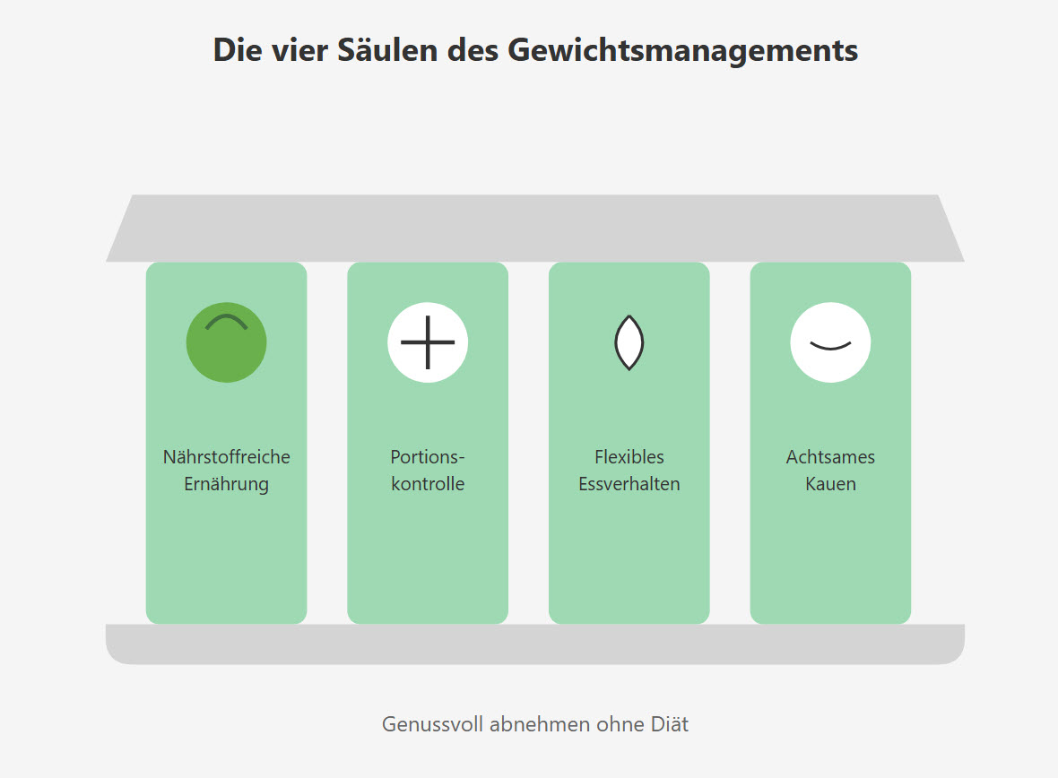 Ein nachhaltiges Gewichtsmanagement basiert auf vier grundlegenden Säulen: nährstoffreiche Ernährung, intuitive Portionskontrolle, flexibles Essverhalten und achtsames Kauen. Indem du Genuss und Körperwahrnehmung in den Vordergrund rückst, kannst du dein Gewicht langfristig halten.